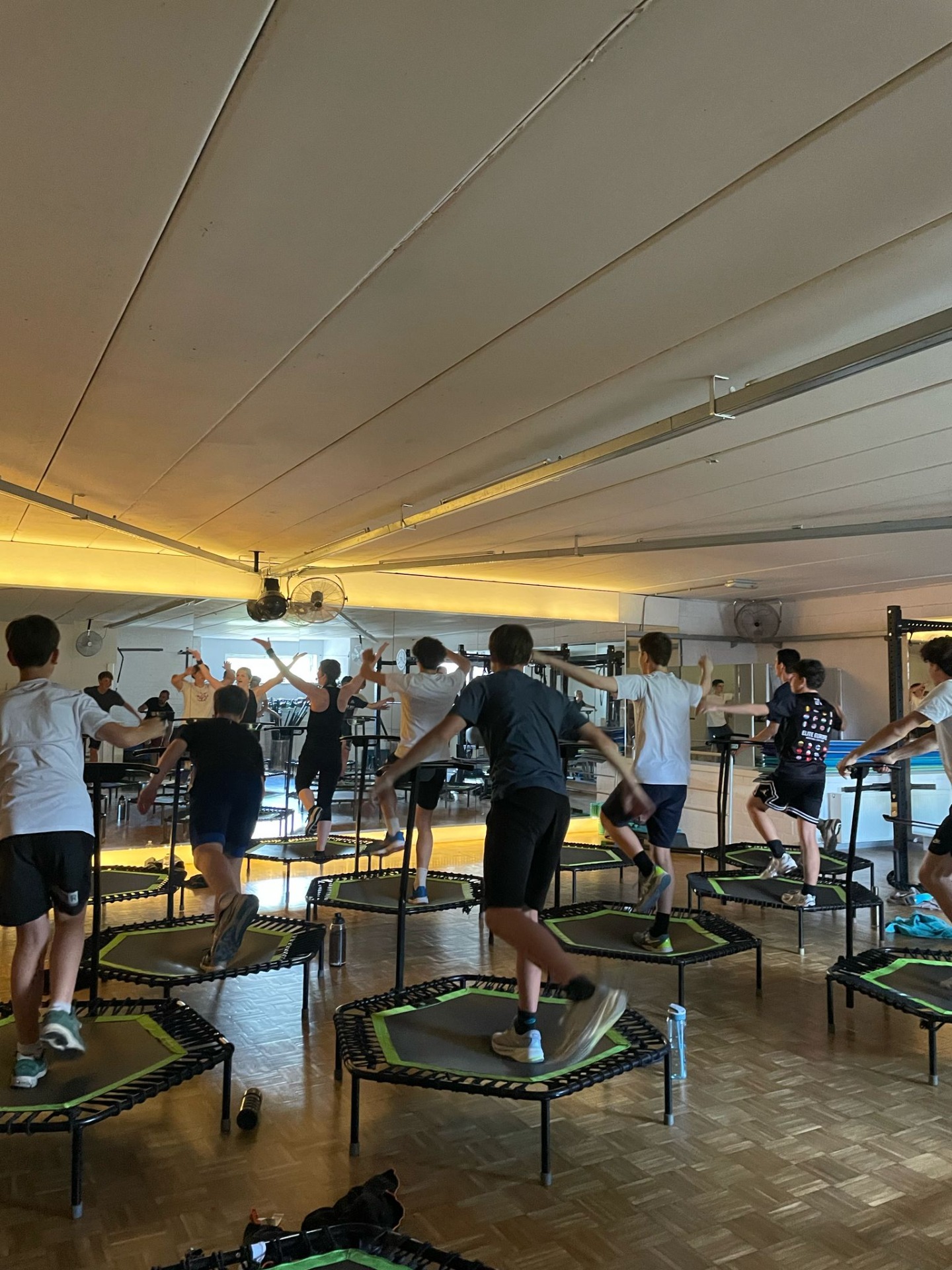Trampoline is belastend voor rug en knieën. Regelmatige turnervaring en voldoende vormspanning is noodzakelijk.